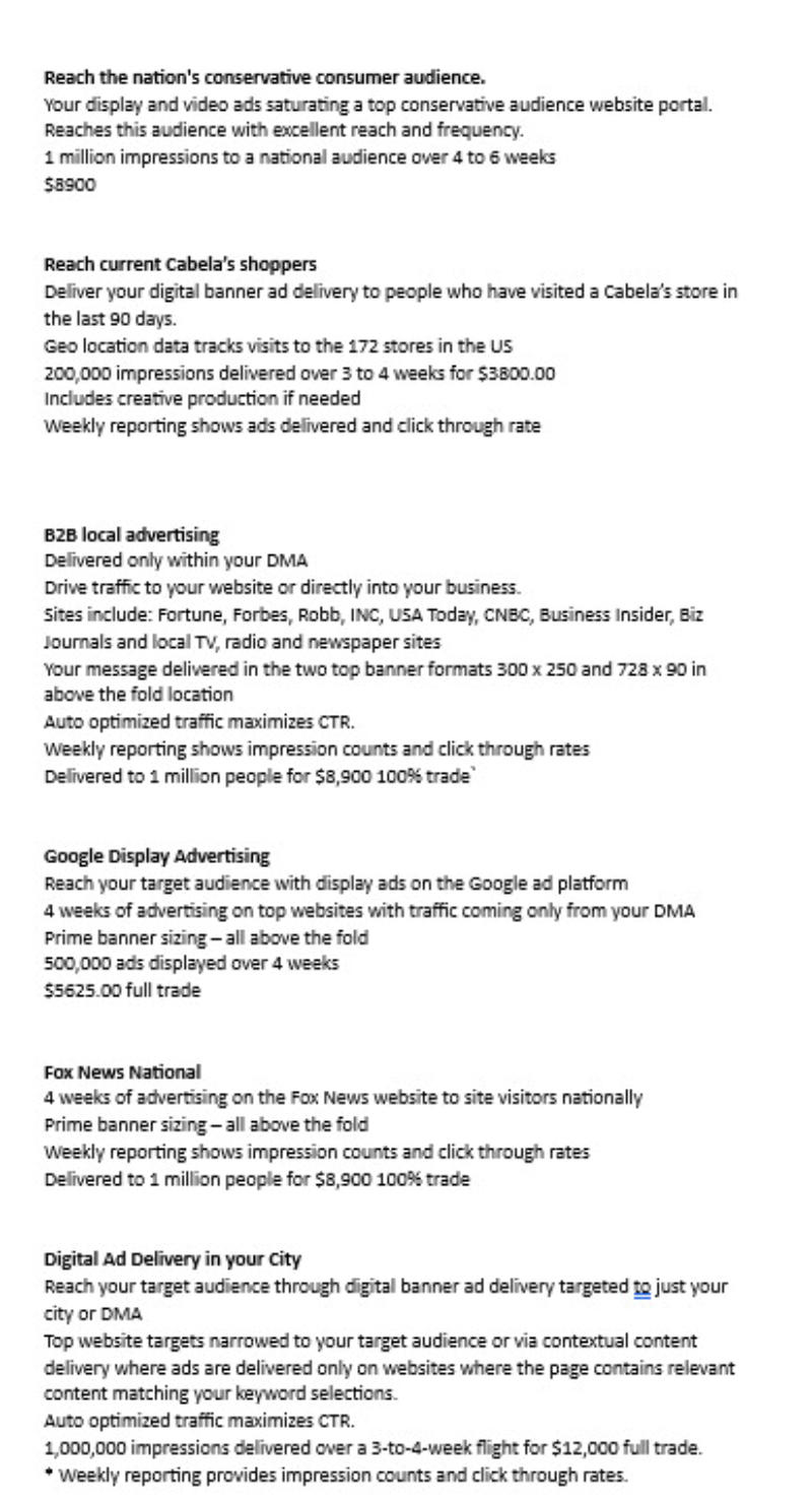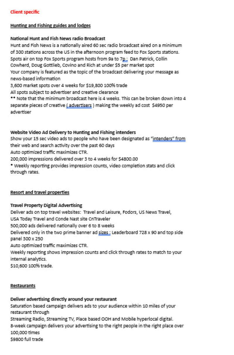 The following is a current list of media placement opportunities available to be sold.This is a basic list of availability. The backbone here is a full service direct response ad agency so if you are looking for a media placement opportunity not shown Please contact me. Please click the page image below to expand or on the PDF image to download the latest avails list